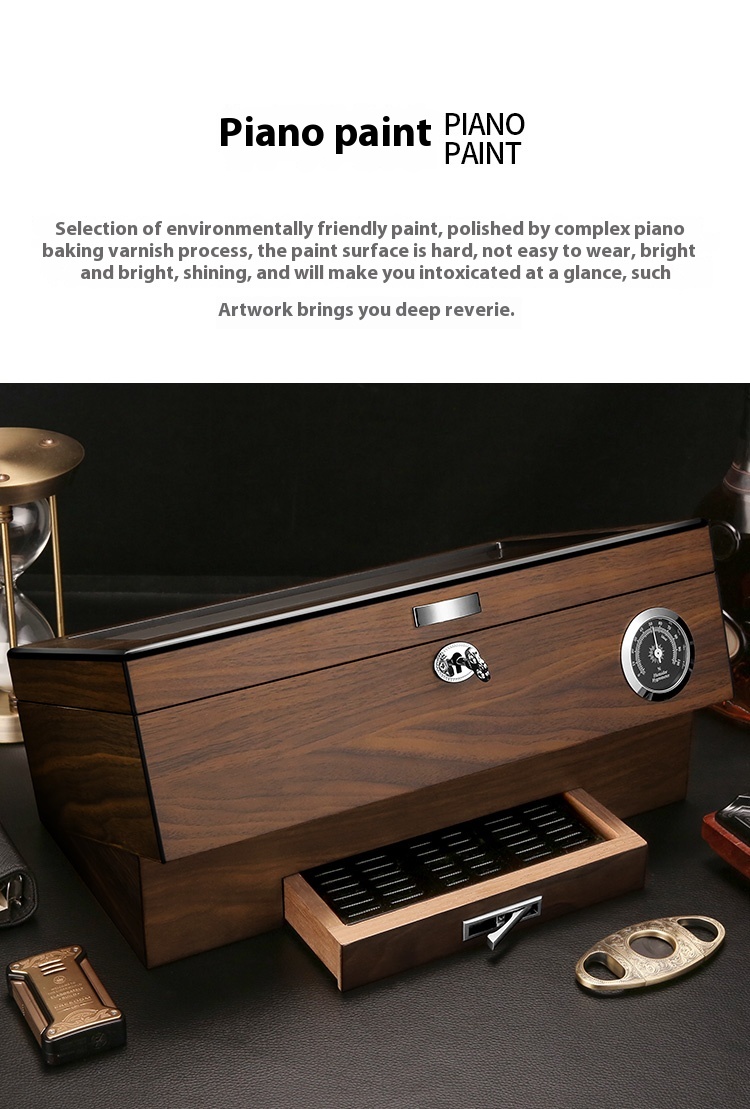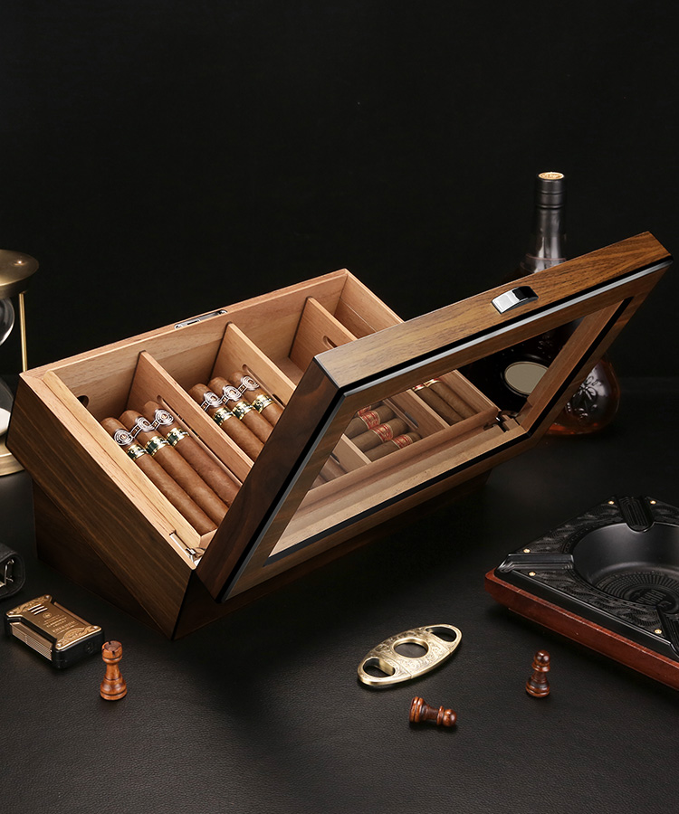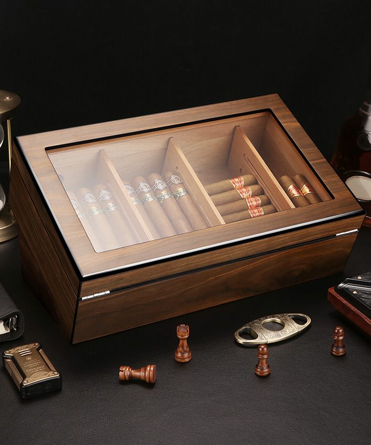 Preserve your finest cigars in this handcrafted cedar wood humidor, engineered for serious collectors. The spacious interior features intelligent partitioning to organize and separate different varieties while maintaining optimal humidity levels. Premium Spanish cedar construction naturally regulates moisture, protecting your investment with time-honored craftsmanship. Ideal for enthusiasts who demand both capacity and meticulous organization in a refined, elegant piece.